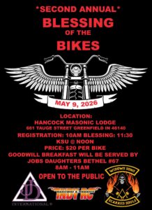 - Saturday May 9 the Scarred souls will be hosting a Blessing of the bikes along with a ride afterwards. Location Hancock lodge 101, 661 Tauge St. Greenfield Indiana. Registration starts 10 Blessing @ 11:30 KSU @ noon. Goodwill breakfast by Jobs Daughters 8 a.m. – 11